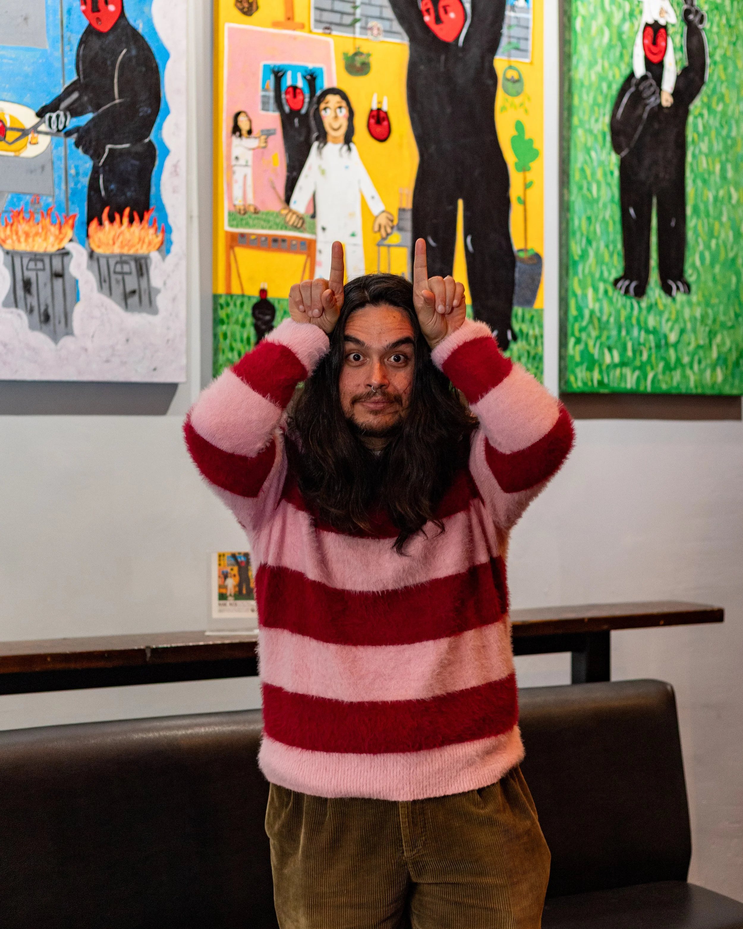 The work in this show includes a selection of recent paintings and ceramic pieces. The paintings are more personal than what I’ve done before. They deal with my mental health — living with bipolar disorder and ADHD — and the way certain thoughts or moods can feel bigger than me. A devil-like figure shows up throughout the work. It represents a part of myself I used to push outside of me, and now try to understand by painting it. When I first started making art, I called myself a “Super Funk Expressionist.” I didn’t know anything about art history — I just meant that I wanted to feel first, think later, and not be afraid to mess things up and keep going. Later on, I learned that my mentor and close friend Richard Silva, who studied under Joan Brown, was connected to the Bay Area Figurative movement. That kind of honest, emotional painting still influences me.