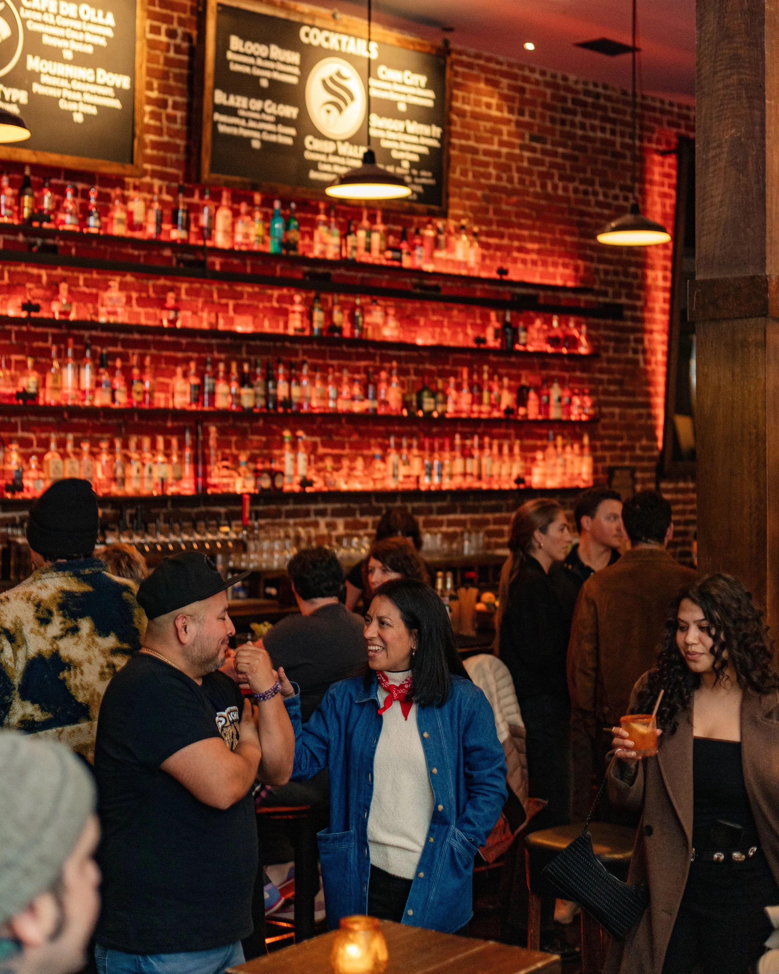 Step into our vibrant space where contemporary design meets historic charm. Original red brick from the 1906 earthquake, soaring vaulted ceilings, and hand-blown light fixtures create an atmosphere that's both relaxed and refined. With hardwood floors, cozy fireplaces, and intimate lounges spread across two levels, we've crafted a space that works whether you're unwinding after work or kicking off a night out.
